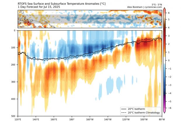 Activitatea de sub suprafața oceanului este, de asemenea, foarte importantă în această situație. Imaginea de mai jos arată anomalia temperaturii oceanului în funcție de adâncime. Masa de apă rece asociată cu La Niña este încă vizibilă în bazinul central al Pacificului, extinzându-se până la aproximativ 150 de metri adâncime (500 de picioare). Totuși, caracteristicile sale de la suprafață au fost erodate, iar în zona estică îndepărtată apar ape mai calde în straturile subterane.