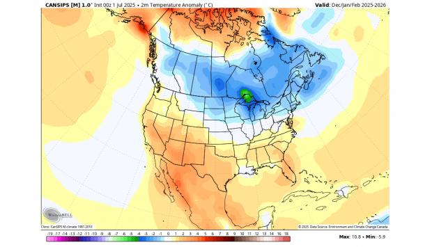 Singura prognoză care acoperă în prezent întreg sezonul de iarnă 2025/2026 este cea a modelului canadian CanSIPS. Aceasta arată, de asemenea, o La Niña slabă în dezvoltare și, după cum se vede în imaginea de mai jos, o masă rece de aer deasupra Canadei și nordului Statelor Unite, foarte asemănătoare analizelor din anii anteriori.