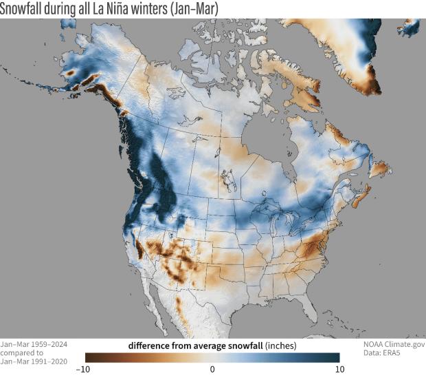 Cum aerul rece este mai accesibil în nordul Statelor Unite și sudul Canadei în timpul unei ierni La Niña, acest lucru crește potențialul de ninsori, dacă este prezentă și umezeala necesară
