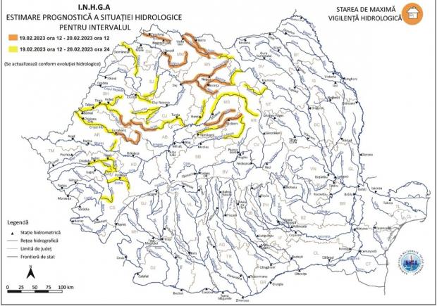 În intervalul 19.02.2023 ora 12:00 – 20.02.2023 ora 24:00 pe râurile din bazinele hidrografice: Tisa – sector aferent S.H. Valea Vişeului, Vişeu, Iza, Lăpuş (judeţul Maramureş), Tur (judeţul Satu Mare), Someşul Mare (judeţul Bistriţa Năsăud), Someşul Mic – bazin amonte Ac. Gilău şi afluenţii aferenţi sectorului aval Ac. Gilău (judeţele: Bihor şi Cluj), Someş – afluenţii mici aferenţi sectorului aval S.H. Dej (judeţele: Cluj, Sălaj, Maramureş şi Satu Mare), Crasna – bazin aval S.H. Şimleul Silvaniei (judeţele: Sălaj şi Satu Mare), Crişul Repede – bazin superior şi afluenţi bazin mijlociu şi inferior (judeţele: Cluj şi Bihor), Crişul Negru (judeţele: Bihor şi Arad), Crişul Alb (judeţele: Hunedoara şi Arad), Mureş – bazin amonte S.H. Glodeni şi afluenţii aferenţi sectorului aval S.H. Glodeni – amonte confluenţă cu râul Arieş (judeţele: Harghita, Mureş şi Bistriţa Năsăud), Târnava Mică – bazin amonte S.H. Târnăveni, Târnava Mare – bazin amonte S.H. Vânători (judeţele: Harghita şi Mureş), Arieş (judeţele: Alba şi Cluj), Mureş – afluenţii aferenţi sectorului aval S.H. Brănişca (judeţele: Hunedoara şi Arad), Bega – bazin amonte S.H. Chizătău (judeţul Timiş), Timiş – bazin amonte S.H. Sadova şi afluenţii aferenţi sectorului aval S.H. Sadova – amonte S.H. Lugoj (judeţele: Caraş Severin şi Timiş), Bistriţa – bazin amonte S.H. Cârlibaba şi afluenţii aferenţi sectorului aval S.H. Cârlibaba – amonte Ac. Izvoru Muntelui (judeţele: Suceava, Neamţ şi Harghita).