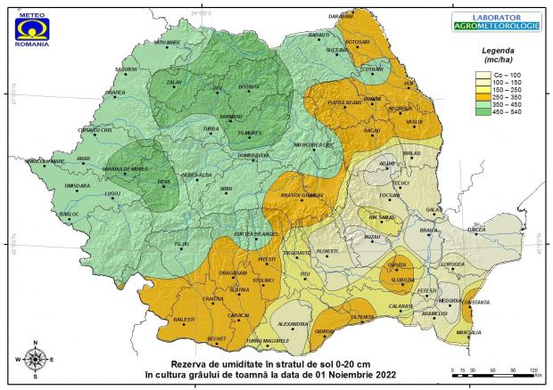 Potrivit raportului ANM întocmit astăzi, aprovizionarea cu apă a solului în stratul 0-20 cm, în cultura grâului de toamnă prezintă valori satisfăcătoare, apropiate de optim și optime, în Maramureș, Crișana, Banat, Oltenia și Transilvania, pe suprafețe agricole extinse din Moldova, local în vestul, sudul și estul Munteniei, izolat estul Dobrogei.