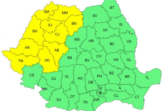 Codul galben de vreme deosebit de caldă va afecta județele: Alba, Arad, Bihor, Bistrița-Năsăud, Cluj, Hunedoara, Maramureș, Sălaj, Satu Mare și Timiș.