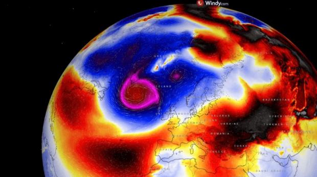 Perturbarea Vortexului Polar a dus la divizarea acestuia în emisfera nordică, trimițând mase de aer extrem de rece din Canada spre Nordul Atlanticului. Acest fenomen a declanșat un ciclon violent de latitudine medie, care s-a format în largul coastei estice a Americii de Nord și se îndreaptă către Europa. Un centru de presiune foarte scăzut, de 930 mbar, se află în apropiere de Newfoundland și continuă să se intensifice rapid.