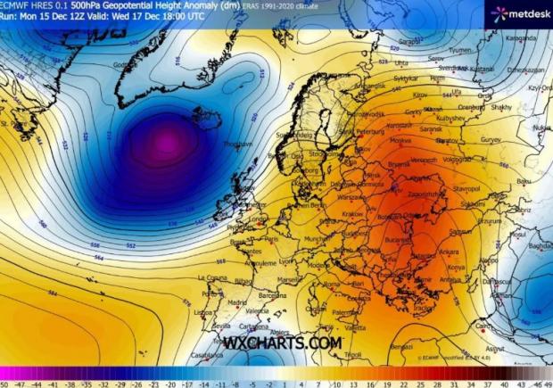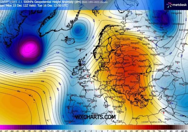 La sud și est, zonele de presiune ridicată de la Azore și pe continentul european formează un pattern de blocaj Omega, menținând vreme stabilă și neobișnuit de caldă la nivel mediu. În același timp, regiunile joase din Europa rămân sub o inversiune termică puternică.