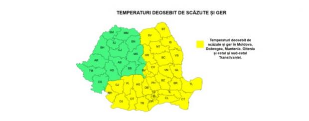 În Moldova, Dobrogea, Muntenia, estul și sud-estul Transilvaniei vremea va fi geroasă. Temperaturile minime se vor situa între -16 și -9 grade, mai coborâte în nordul Moldovei până în jurul a -20 de grade.