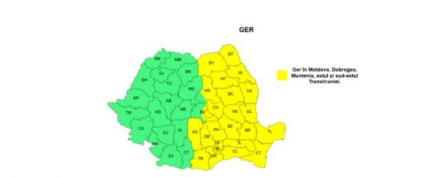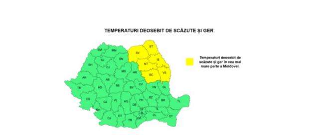 În județele Suceava, Botoșani, Neamț, Iași, Bacău și Vaslui este în vigoare un Cod galben de ger, între orele 10:00 - 20:00.