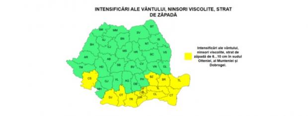 În județele Caraș – Severin, Dolj, Olt, Teleorman, Giurgiu, Ilfov, inclusiv municipiul București, Buzău, vestul județelor Brăila, Ialomița și Călărași și în județele Constanța, Tulcea (în special zona costieră), vor fi intensificări ale vântului cu viteze la rafală în general de 50...55 km/h, viscolind temporar ninsoarea.