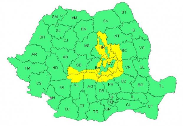 Sub codul galben se vor afla județele Argeș, Bacău, Brașov, Buzău, Covasna, Dâmbovița, Harghita, Prahova, Sibiu, Vâlcea şi Vrancea.
