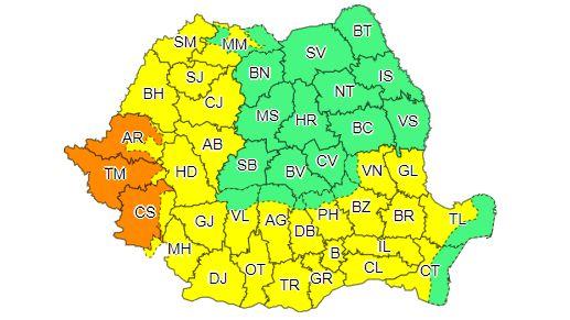 Atenționare meteorologică de cod galben pentru astăzi și mâine pentru zona de vest și sud a țării, acolo unde temperaturile maxime vor fi între 33 până la 37 de grade, valul de căldură va fi în extindere și în partea de vest a Transilvaniei, Maramureș, sudul Moldovei și zona continentală a Dobrogei.