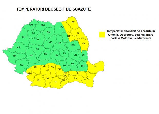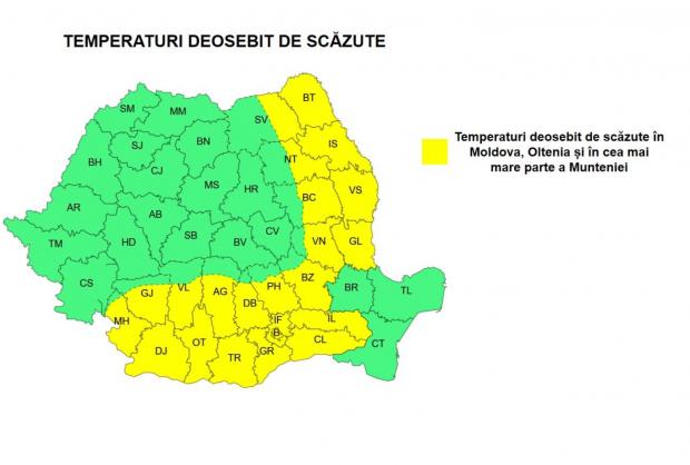 Pentru intervalul 3 februarie, ora 20:00 – 4 februarie, ora 10:00, este în vigoare un nou Cod galben de ger în Moldova, Oltenia și în cea mai mare parte a Munteniei, unde temperaturile minime vor coborî până la -9…-6 grade Celsius.