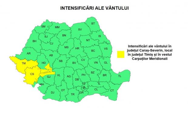 De asemenea, ANM a emis o atenționare Cod galben de vânt, valabilă în intervalul 4 februarie, ora 08:00 – 5 februarie, ora 20:00. Vântul va sufla cu putere în județul Caraș-Severin și local în Timiș, cu viteze de 50–70 km/h, iar în Munții Banatului și în zona înaltă din vestul Carpaților Meridionali rafalele vor atinge 90–100 km/h, viscolind temporar ninsoarea.