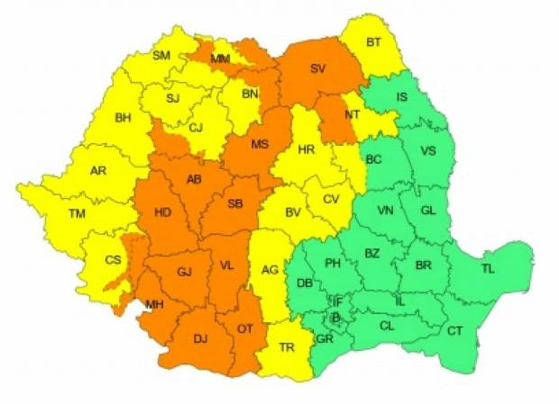 În Oltenia, local în Transilvania, nord-vestul Moldovei, în Carpații Occidentali și în nordul Carpaților Orientali, vor fi averse torențiale, frecvente descărcări electrice, vijelii puternice (viteze ale vântului de 70...90 km/h) și grindină de medii și mari dimensiuni (2...5 cm). În intervale scurte de timp sau prin acumulare, cantitățile de apă vor fi de 30...40 l/mp și pe arii restrânse de peste 50...60 l/mp.