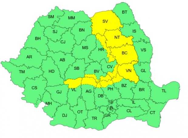 În cea mai mare parte a Carpaților Orientali și a Carpaților Meridionali, precum și în vestul Moldovei, vor fi perioade cu instabilitate atmosferică accentuată ce se va manifesta prin averse torențiale, descărcări electrice, intensificări ale vântului (rafale de 50...70 km/h) și izolat grindină. În intervale scurte de timp sau prin acumulare, cantitățile de apă vor fi de 15...20 l/mp și izolat de 30...40 l/mp.