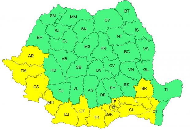 Potrivit ANM, joi la ora 12:00 intră în vigoare un cod galben de caniculă și disconfort termic ridicat, ce va fi valabil până diseară, la ora 21:00, în 13 județe și în București.