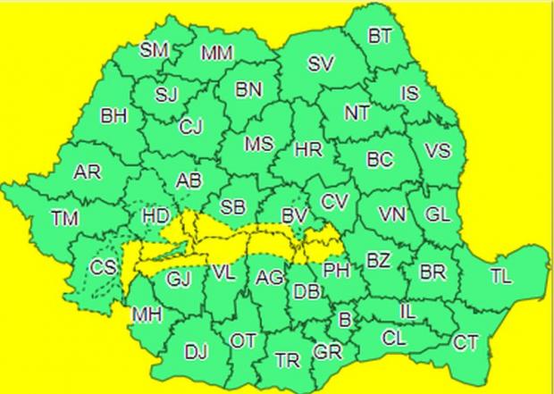 Avertizarea Cod galben intră în vigoare miercuri la ora 22:00 și expiră joi la ora 14:00.