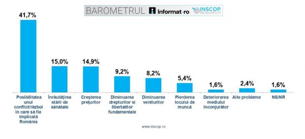 După teama de război, înrăutățirea stării de sănătate reprezintă cea mai importantă sursă de îngrijorare pentru 15% dintre cei intervievați, în timp ce creșterea prețurilor este menționată de 14.9%. Mai departe, 9.2% dintre respondenți sunt cel mai mult îngrijorați de diminuarea drepturilor si libertăților fundamentale, 8.2% de diminuarea veniturilor, 5.4% de pierderea locului de muncă, iar 1.6% de deteriorarea mediului înconjurător.