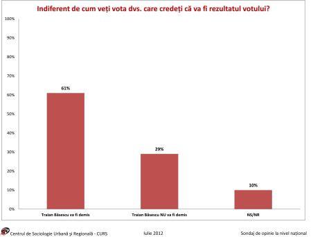 Potrivit acestui sondaj, 61% dintre cei chestionaţi cred că, indiferent de felul cum vor vota la referendumul din 29 iulie, preşedintele Traian Băsescu va fi demis din funcţie. 29% cred că Băsescu nu va fi demis, iar 10% nu ştiu/nu răspund.