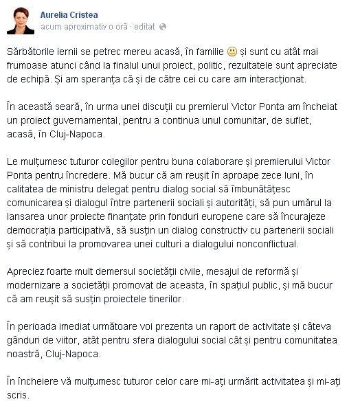 "Sărbătorile iernii se petrec mereu acasă, în familie şi sunt cu atât mai frumoase atunci când la finalul unui proiect, politic, rezultatele sunt apreciate de echipă. Şi am speranţa că şi de către cei cu care am interacţionat. În această seară, în urma unei discuţii cu premierul Victor Ponta am încheiat un proiect guvernamental, pentru a continua unul comunitar, de suflet, acasă, în Cluj-Napoca", a scris Aurelia Cristea, sâmbătă, pe pagina sa de Facebook.