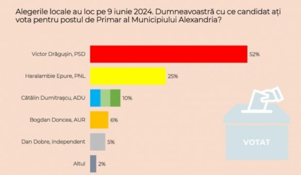 Astfel, conform datelor, 52% dintre cetăţenii Alexandriei îl vor vota pe 9 iunie pe Victor Drăgușin, în timp ce 25% dintre alegători vor opta pentru Haralambie Epure.