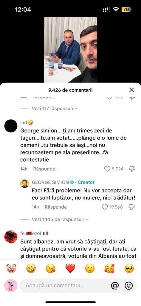 Simion a anunțat pe pagină sa de Facebook că va face „anunțuri importante” la ora 14:30 și la ora 19:00. Ulterior, într-un mesaj publicat pe TikTok, Simion a răspuns unui susținător al său care l-a întrebat despre contestarea rezultatului alegerilor. „Fac. Fără probleme. Nu vor accepta, dar eu sunt un luptător”, a scris Simion.