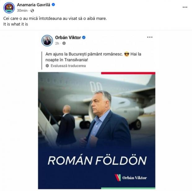 Gavrilă a preluat o postare a lui Orban în care a acesta spune că a ajuns la București „pe pământ românesc”, urmând să plece „în Transilvania”.