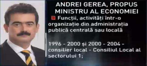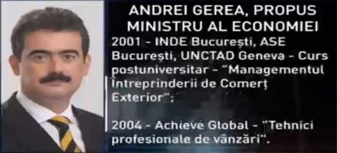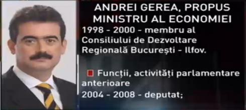 La învestirea lui Gerea ca ministru, preşedintele Traian Băsescu i-a urat succes noului membru al Guvernului şi i-a transmis că are două obiective dificile la şefia Ministerului Economiei, respectiv Oltchim şi Cuprumin.