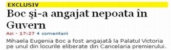 Cât priveşte angajarea Mihaelei Boc în Guvern, trebuie spus că acest lucru se întâmplă în timp ce sute de oameni sunt concediaţi din Executiv, premierul Emil Boc dând de înţeles că are mai mare încredere în rude decât în personalul de specialitate. Mai mult, ultimele angajări din Guvern au vizat doar oameni proveniţi de la Cluj, semn că fostul primar nu îşi uită foştii colegi şi face orice pentru a îi aduce la Bucureşti.