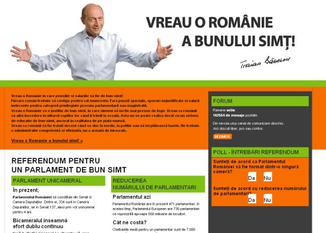 Într-adevăr, pe site-ul de campanie al lui Traian Băsescu a fost postat un slogan aproape identic: ?Vreau o Românie a bunului simţ!?. Preşedintele susţine însă că acesta nu este sloganul său pentru campania electorală.