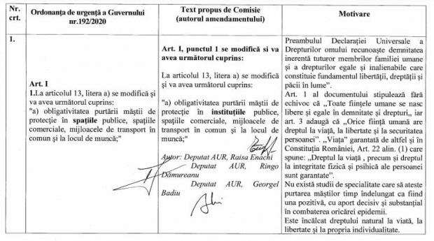 În motivarea amendamentului, cei trei parlamentari susțin că "nu există studii de specialitate care să ateste că purtarea măștilot timp îndelungat ca fiind una pozitivă, cu aport decisiv și substanțial în combaterea oricărei epidemii".