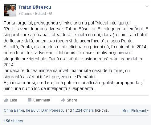 "Ponta, orgoliul, propaganda şi minciuna nu pot înlocui inteligenţa! Politic avem doar un adversar. Tot pe Băsescu. El culege ce a semănat. E singurul care are capacitatea de a se lupta cu noi, dar aşa cum l-am bătut de fiecare dată, putem s-o facem şi de acum încolo, a spus Ponta. Ascultă, Ponta, n-ai înţeles nimic. Nici azi nu pricepi că, în noiembrie 2014, nu eu ţi-am fost adversar, ci Iohannis. Din acest motiv ai şi pierdut alegerile prezidenţiale. Dacă n-ai aflat, te asigur eu că n-am candidat in 2014. Iar dacă te ducea mintea să înveţi măcar cîte ceva de la mine, cu siguranţă astăzi ai fi fost preşedintele României. Eşti încă tînăr şi, cred eu, încă poţi să mai afli că orgoliul, propaganda şi minciuna nu ţin loc de inteligenţă şi experienţă", a scris Traian Băsescu.