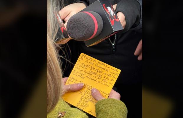Soția lui Călin Georgescu, Cristela Georgescu, a venit miercuri la Parchetul General. Aceasta a venit înconjurată de bodyguarzi. Cristela Georgescu ținea în mână un bilețel galben pe care era scrisă o rugăciune.