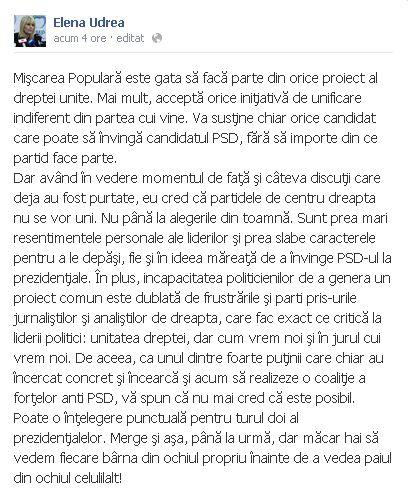 Elena Udrea susţine, într-o postare pe Facebook, că partidele de centru-dreapta nu se vor uni, deoarece "sunt prea mari resentimentele personale ale liderilor şi prea slabe caracterele", ea susţinând că se va putea face doar o înţelegere punctuală pentru turul al doilea al prezidenţialelor.