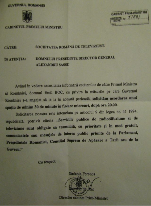 În replică, purtătorul de cuvânt al Executivului, Ioana Muntean a precizat că solicitarea adresată TVR de premierul Emil Boc privind prezenţa sa la emisiuni săptămânale este întemeiată pe Legea 41/1994 privind organizarea şi funcţionarea serviciilor publice de radio şi TV, iar actuala perioadă impune ca primul-ministru să comunice direct deciziile Guvernului.