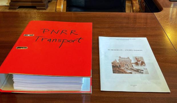 Astfel, pe birou apare un dosar ce poartă numele "PNRR Transport", ce pare a fi dosarul întocmit de Drulă pentru Planul Naţional de Redresare şi Rezilienţă, dar şi un document cu numele "In memoriam... Anghel Saligny".