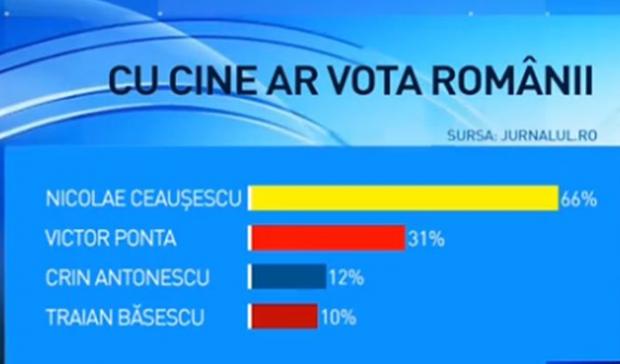 Ceauşescu ar obţine 66% dintre voturile românilor, cu mult sub cifra cu care era obişnuit dictatorul în anii Epocii de Aur, dar de două ori mai mare decât ar putea aduna următorul clasat Victor Ponta.