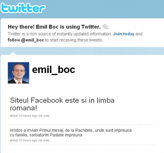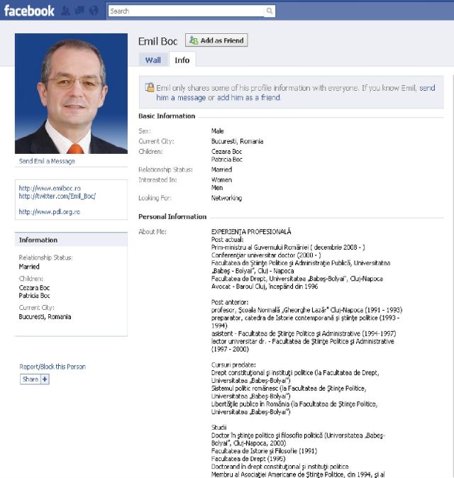 Emil Boc şi-a creat contul de pe Facebook duminică seară târziu. Pe pagina personală el recunoaştea că este interesat de femei şi bărbaţi, iar la capitolul prezentări a postat un link şi o poză cu Elena Udrea. În ziua de Paşte premierul Emil Boc recunoştea că a rămas unul dintre puţinii politicieni care nu era activ pe internet.