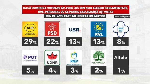 Potrivit unui sondaj realizat de Avangarde, prezentat luni seara de Antena 3 CNN, dacă duminica viitoare ar avea loc din nou alegeri parlamentare, AUR ar obține cele mai multe voturi - 29%, fiind urmat de PSD, USR și PNL.