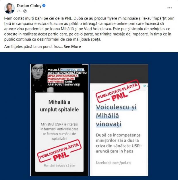 "I-am costat mulţi bani pe cei de la PNL. După ce au produs flyere mincinoase şi le-au împărţit prin ţară în campania electorală, acum au plătit o întreagă campanie online prin care încearcă să arunce vina pandemiei pe Ioana Mihăilă şi pe Vlad Voiculescu.