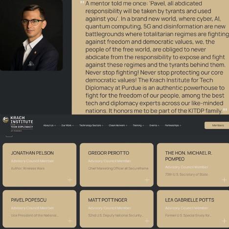 Din același organism consultativ mai fac parte, printre alte personalități ale politicii internaționale și reprezentanți ai industriei și mediului academic de la nivel global, fostul secretar de stat al Statelor Unite ale Americii Mike Pompeo, fostul secretar de stat adjunct pentru securitate națională al SUA Matt Pottinger, fostul asistent pentru securitate națională al SUA Robert O’Brien, fostul subsecretar de stat pentru Creștere economică, Energie și mediu Keitch Krach, membrul Parlamentului Marii Britanii Sir Iain Duncan Smith, fostul ambasador al SUA în România Adrian Zuckerman, dar și Mircea Geoană, secretar general adjunct al NATO.