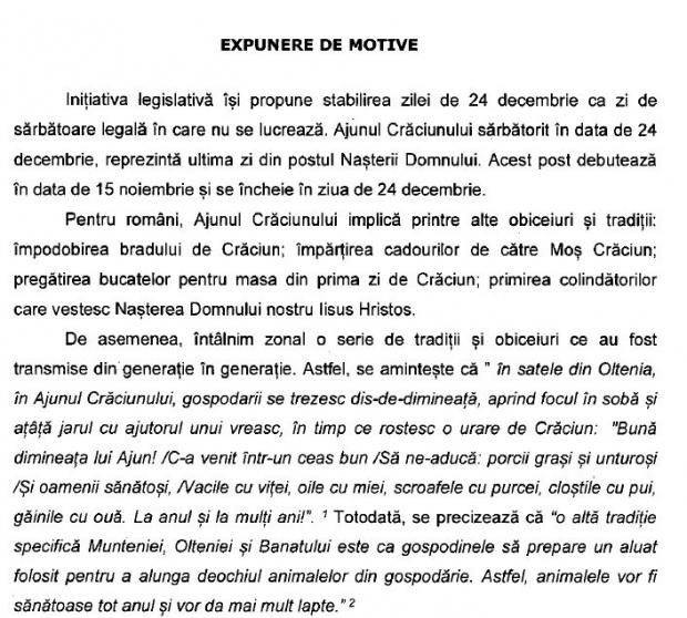 "Iniţiativa legislativă îşi propune stabilirea zilei de 24 decembrie ca zi de sărbătoare legală în care nu se lucrează. Ajunul Crăciunului sărbătorit în data de 24 decembrie, reprezintă ultima zi din Postul Naşterii Domnului. Acest post debutează în data de 15 noiembrie şi se încheie în ziua de 24 decembrie.