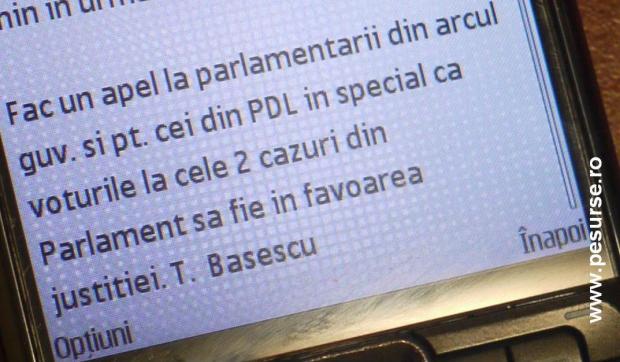 "În seara asta (n.r. - marţi) la 19.25 deputaţii PDL (probabil că şi de la UNPR, Minorităţi şi UDMR) au primit câte un sms din partea preşedintelui Traian Băsescu. Iată sfatul preşedintelui înaintea celor două voturi din Camera Deputaţilor", se arată pe site-ul pesurse.ro.