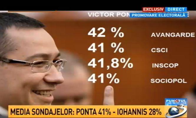 Patru sondaje de opinie care arată că premierul Victor Ponta are cele mai mari şanse la alegerile prezidenţiale de duminică au fost prezentate duminică, la emisiunea Punctul de întâlnire, de la Antena 3.