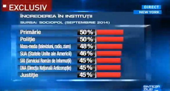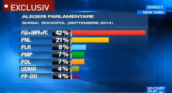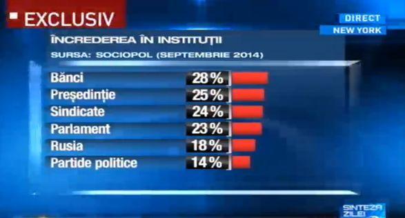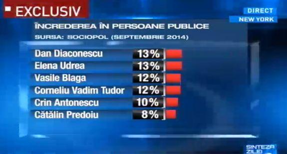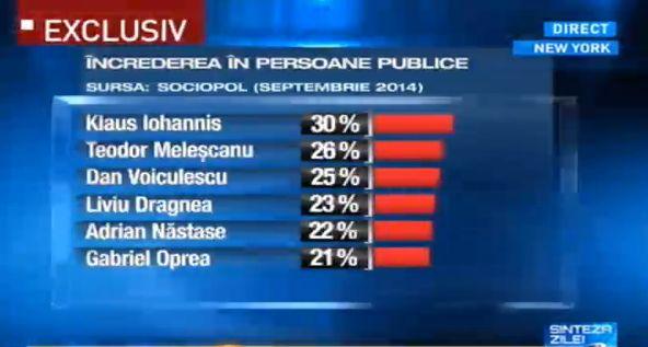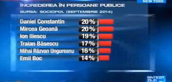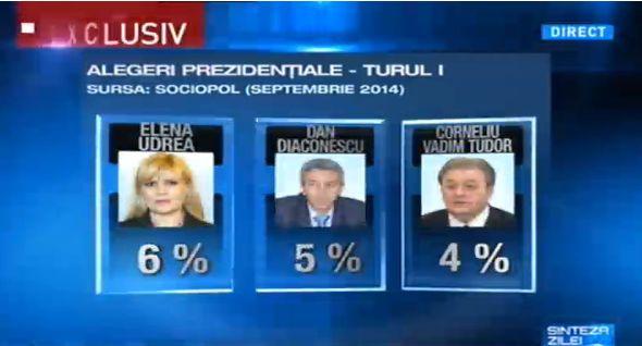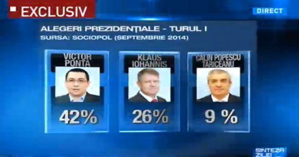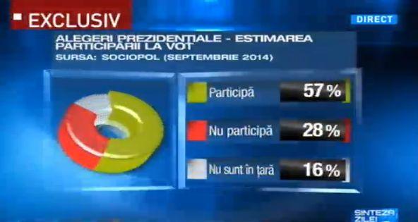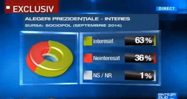 Mai bine de jumătate dintre români sunt interesaţi de alegerile prezidenţiale. Mai precis 63 la sută, după cum reiese dintr-un sondaj făcut de Sociopol. 57 la sută dintre cei chestionaţi spun că s-ar prezenta la vot, dacă alegerile prezidenţiale ar avea loc duminica viitoare. Victor Ponta conduce detaşat în opţiunile electoratului, cu 42 de procente. Este urmat de Klauss Iohannis, cu 26 la sută şi Călin Popescu Tăriceanu cu 9 procente. Confruntarea în turul doi s-ar face astfel între Ponta şi Johannis.