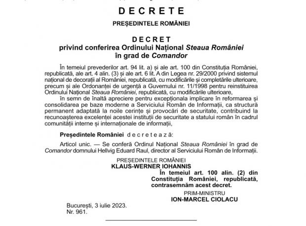 ”Se conferă ordinul Național Steaua României în grad de comandor Domnului Hellvig Eduard Raul, director al Serviciului Român de Informații”, se arată în decretul semnat de Klaus Iohannis.