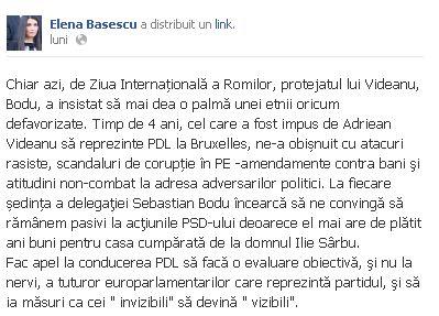 "Protejatul lui Videanu, Bodu, a insistat să mai dea o palmă unei etnii oricum defavorizate. Timp de 4 ani, cel care a fost impus de Adriean Videanu să reprezinte PDL la Bruxelles, ne-a obişnuit cu atacuri rasiste, scandaluri de corupţie în PE - amendamente contra bani şi atitudini non-combat la adresa adversarilor politici. La fiecare şedinţă a delegaţiei Sebastian Bodu încearcă să ne convingă să rămânem pasivi la acţiunile PSD-ului deoarece el mai are de plătit ani buni pentru casa cumpărată de la domnul Ilie Sârbu", scrie Elena Băsescu pe pagina personală de Facebook.