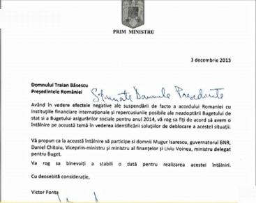 "Stimate Domnule Preşedinte, având în vedere efectele negative ale suspendării de facto a acordului României cu instituţiile financiare internaţionale şi repercusiunile posibile ale neadoptării Bugetului de stat şi a Bugetului asigurărilor sociale pentru anul 2014, vă rog să fiţi de acord să avem o întâlnire pe această temă în vederea identificării soluţiilor de deblocare a acestei situaţii.