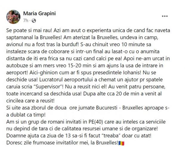 Doresc zile frumoase invitaților mei, la Bruxelles!”, a scris europarlamentarul Maria Grapini pe Facebook.