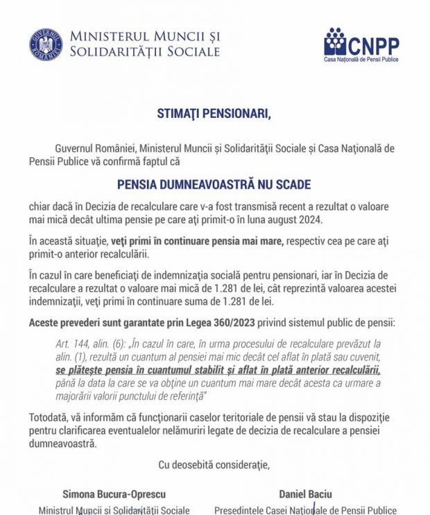 Guvernul României, Ministerul Muncii și Solidarității Sociale și Casa Natională de Pensii Publice vă confirma faptul că PENSIA DUMNEAVOASTRA NU SCADE, chiar dacă în Decizia de recalculare care v-a fost transmis recent a rezultat o valoare mai mică decât ultima pensie pe care ati primit-o în luna august 2024.