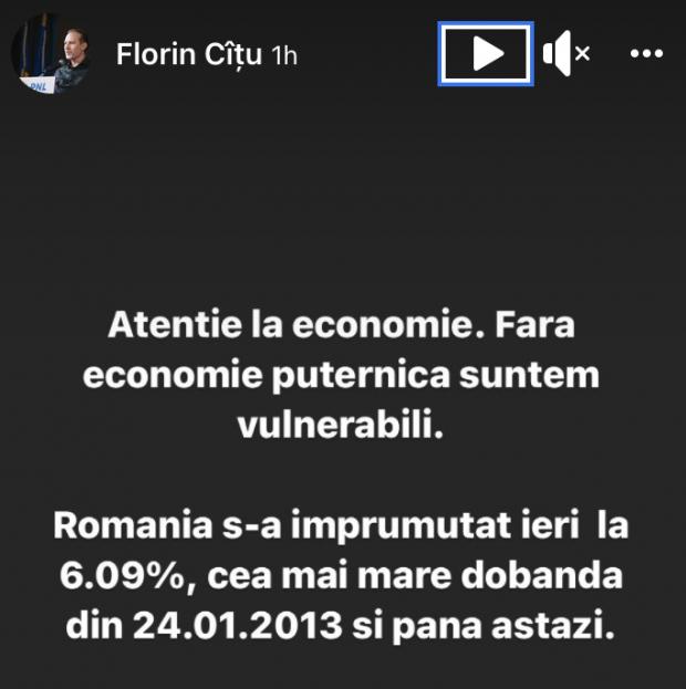 Romania a împrumutat ieri la 6.09%, cea mai mare dobândă din 24.01.2013 și până astăzi”, a scris Florin Cîțu într-un story pe Facebook.