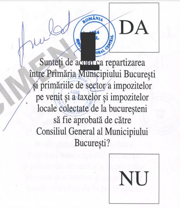 - Al doilea buletin de vot vizează împărţirea taxelor şi impozitelor locale între Primăria Generală şi primăriile de sector şi cuprinde cea de-a doua întrebare. Aceasta este: „Sunteţi de acord ca repartizarea între Primăria Municipiului Bucureşti şi primăriile de sector a impozitelor şi taxelor locale colectate de la bucureşteni să fie aprobată de către Consiliul General al Municipiului Bucureşti?”